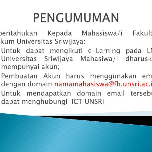 Diberitahukan kepada Dosen dan Mahasiswa Fakultas Hukum Universitas Sriwijaya, untuk pembuatan akun email nama@fh.unsri.ac.id dapat memberikan data sbb: Nama Lengkap