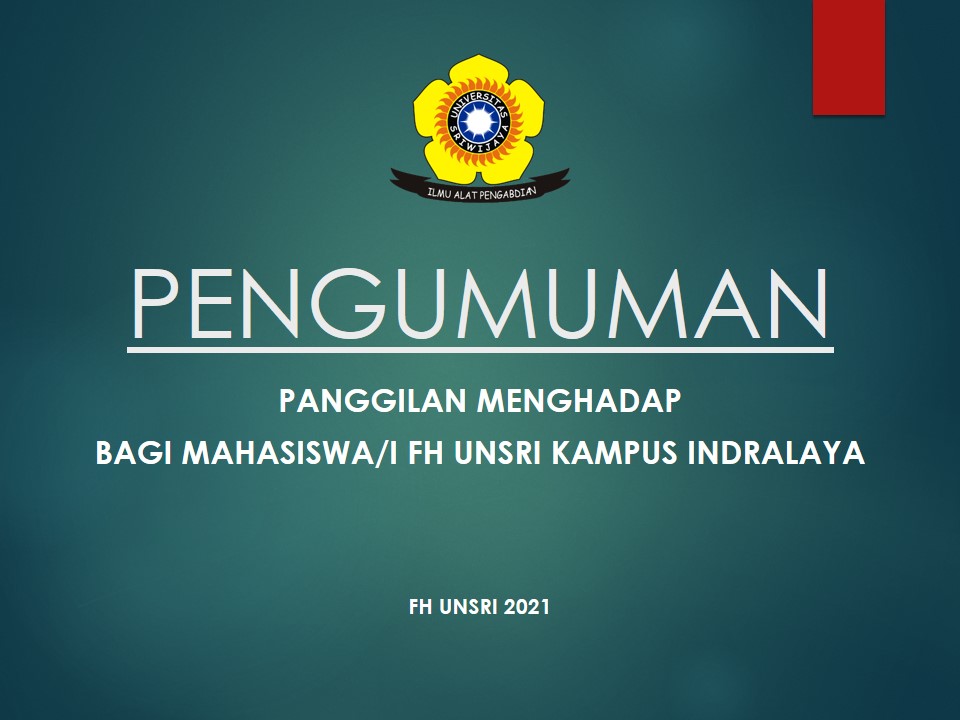 Diberitahukan kepada Mahasiswa/i Fakultas Hukum Unsri Kampus Indralaya yang Namanya tersebut di dalam lampiran dibawah ini untuk menghadap ke Bagian Akademik Fakultas Hukum Unsri Kampus Palembang setiap hari kerja