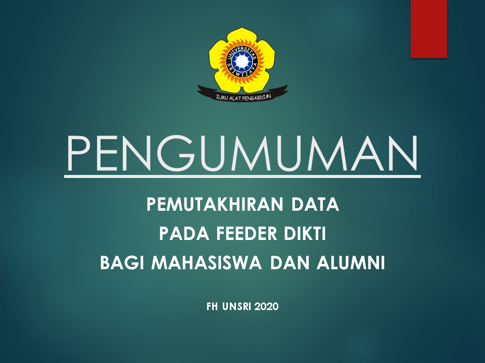 Kami beritahukan kepada seluruh Mahasiswa dan Alumni Fakultas Hukum Universitas Sriwijaya, bahwa sehubungan dengan Pemutakhiran Data pada Feeder DIKTI, maka kami mengharapkan kerjasama kepada Saudara/i untuk mengecek Data Akademik di Forlap DIKTI, jika ada kesalahan atau Nama tidak muncul di Forlap DIKTI, maka untuk perbaikan Nama Kami perlukan Dokumen sebagai berikut:
