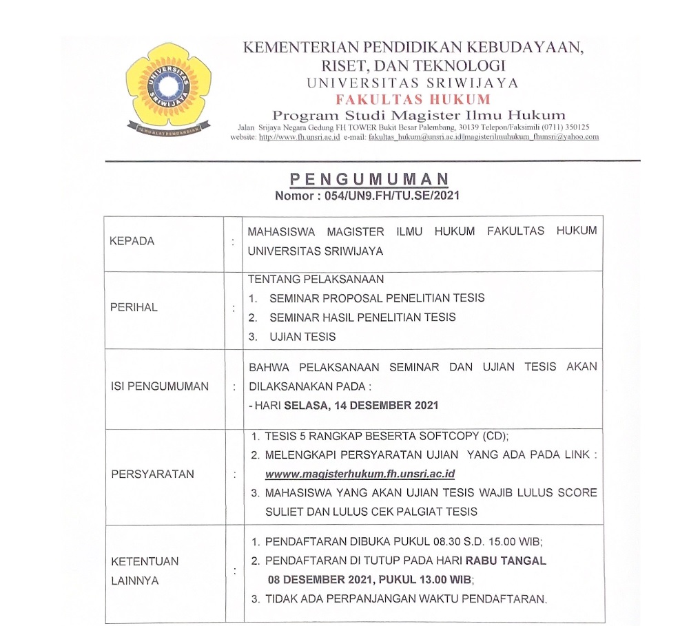 Pengumuman batas akhir pendaftaran Seminar dan Ujian Tesis Tahun 2021 Semester Ganjil 2021/2021 Program Studi Magister Ilmu Hukum