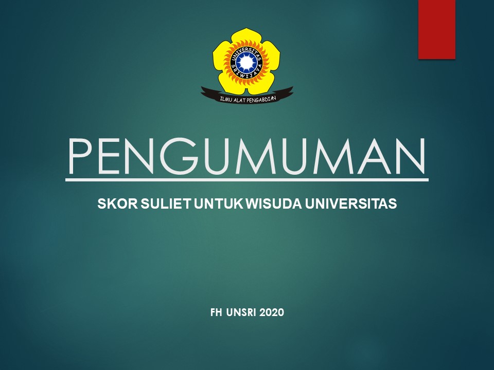 Untuk dapat mengikuti Wisuda Universitas, maka Mahasiswa/i WAJIB memenuhi persyaratan nilai SULIET dengan skor 475 atau memiliki Sertifikat Intensive Academik Purpose dari Sriwijaya University Language Institution (SULI).