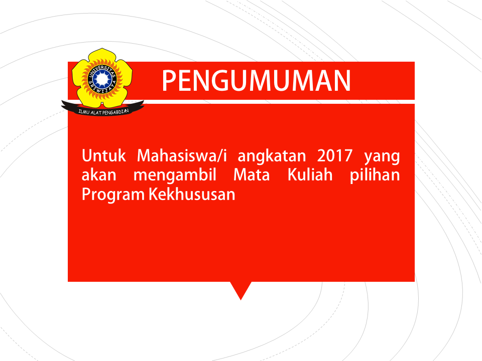 Untuk Mahasiswa/i angkatan 2017 yang akan mengambil Mata Kuliah pilihan Program Kekhususan bahwa “TIDAK DI BENARKAN UNTUK MENGAMBIL MATA KULIAH PILIHAN LINTAS BAGIAN”.