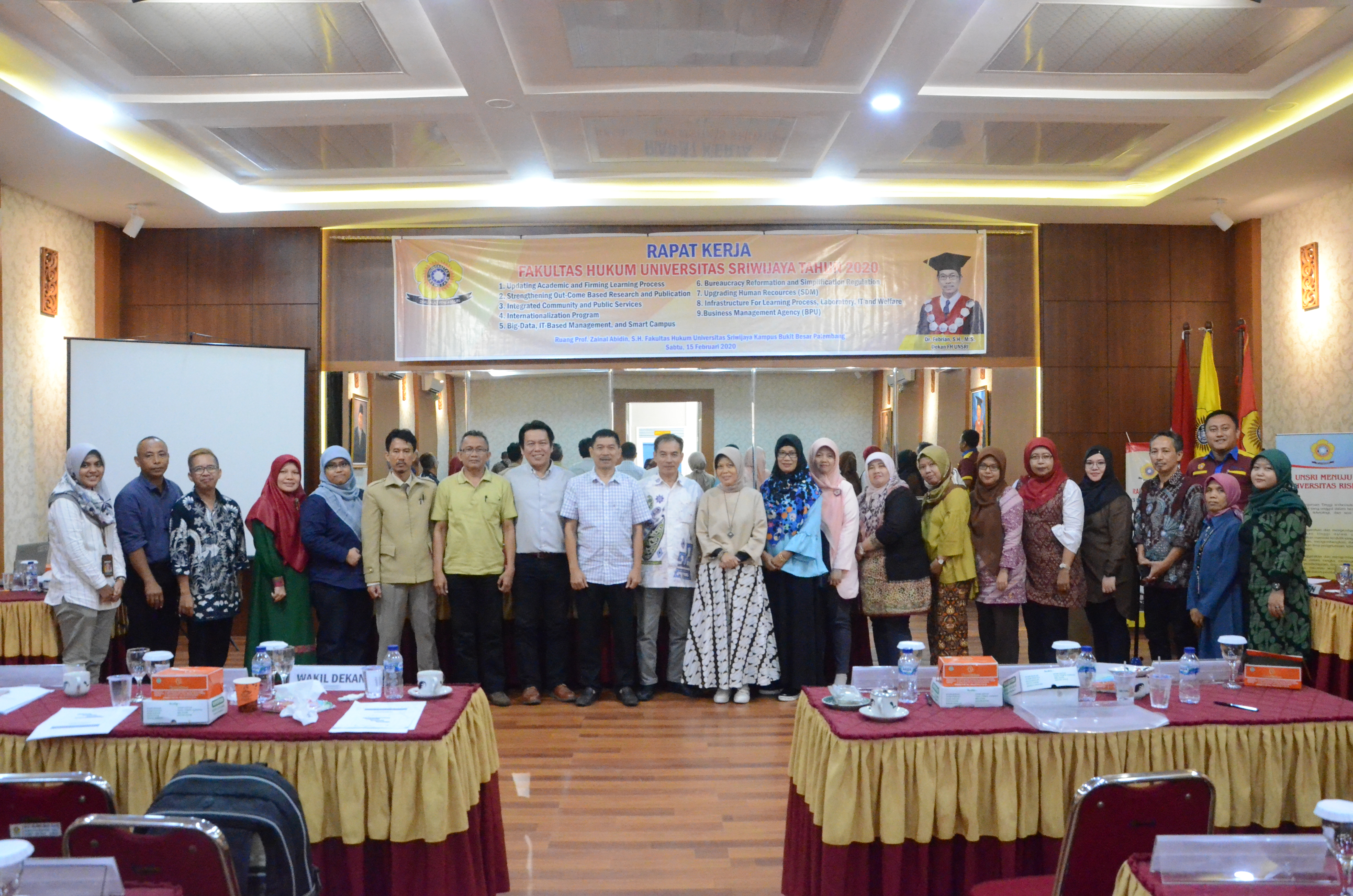 Indralaya – Fakultas Hukum Universitas Sriwijaya mengadakan Rapat Kerja (RAKER) Fakultas Hukum Universitas Sriwijaya Tahun 2020 di Ruang Prof. Zainal Abidin kampus palembang, Sabtu (15/02/2020). Rapat Kerja merupakan kegiatan tahunan fakultas yang membahas tentang rencana kegiatan dan anggaran untuk setahun yang akan datang. Dalam Rapat Kerja kali ini turut dihadiri oleh sejumlah civitas akademika Fakultas Hukum UNSRI, seperti Dekan, para Wakil Dekan, Ketua & Sekretaris Bagian Perdata, Pidana, HTN, HAN, HI, Koordinator Prodi S3, Koordinator Prodi S2, Ketua Prodi MKn (Kenotariatan), Kasubag,  Bagian Kemahasiswaan, Akademik, Kepegawaian, Administrasi Pegawai, Keuangan dan Tata Usaha.