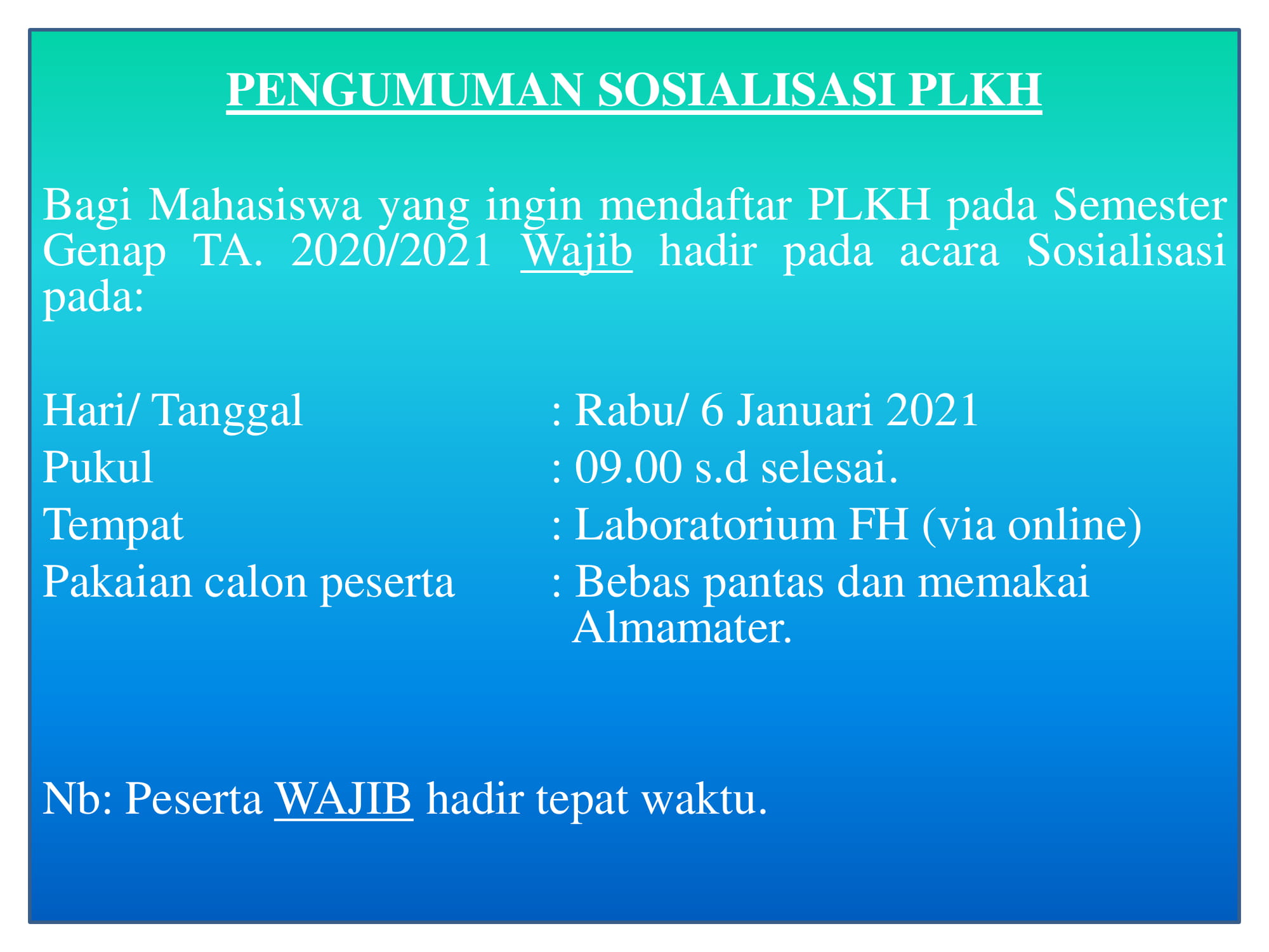Diberitahukan kepada Mahasiswa/i yang ingin mendaftar PLKH pada Semester Genap TA. 2020/2021 wajib hadir pada acara Sosialisasi pada :
