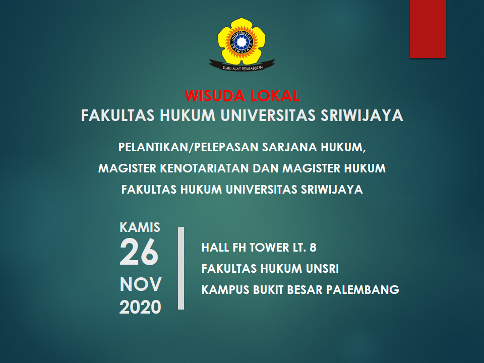 Pelaksanaan Wisuda Lokal Pelantikan/Pelepasan Sarjana Hukum, Magister Kenotariatan dan Magister Hukum Fakultas Hukum Universitas Sriwijaya Tahun 2020, yang akan dilaksanakan pada: